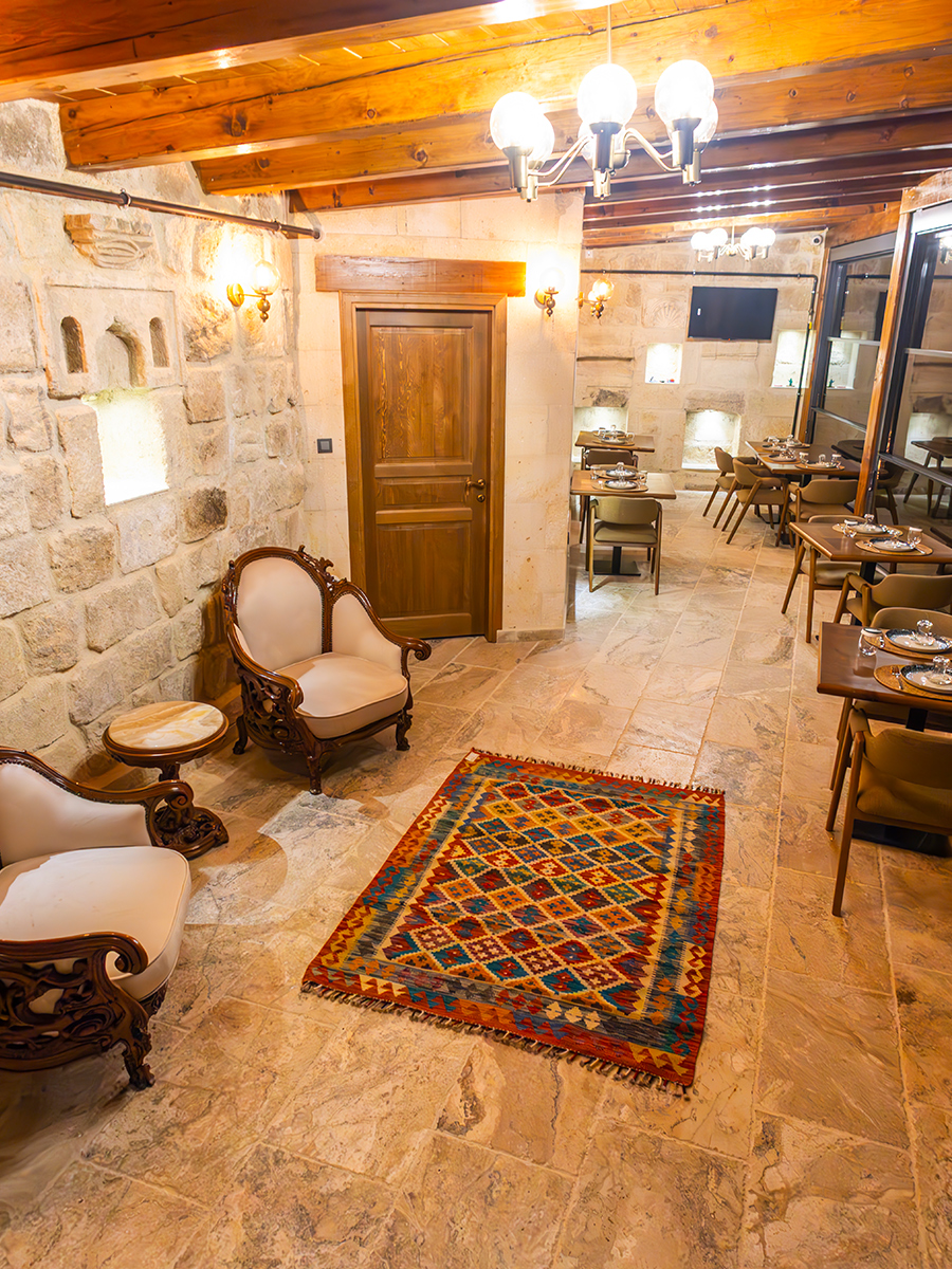 Odalarda, bölgenin geleneksel işlemeleri ve motifleri ile tasarlanmış detaylar, Kapadokya'nın kültürel yansımalarını size sunmaktadır. Ayrıca, odalarımızda bulunan halılar Anadolu'nun dört bir yanında geleneksel el işçiliğiyle dokunmuş eserlerdir. Her biri bu kadim toprakların kültürünü ve sanatını yansıtmaktadır. Bu halılara dokunarak, geleneksel Anadolu sanatını daha yakından hissedebilirsiniz.